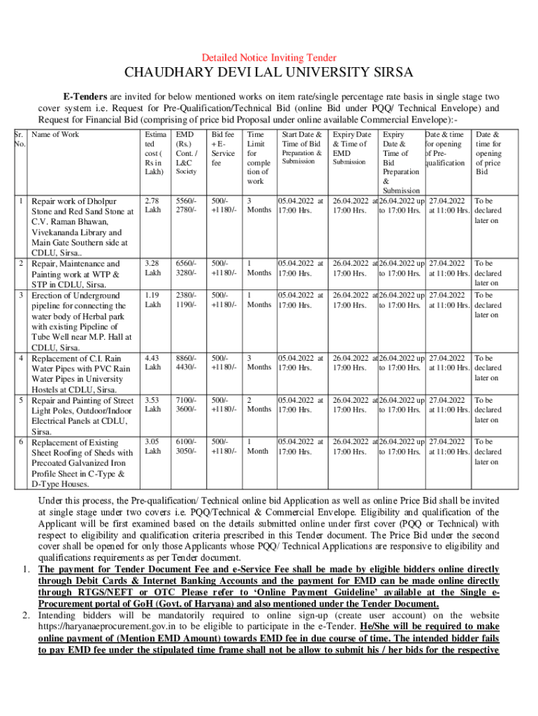 Detailed Notice Inviting TenderCHAUDHARY DEVI LAW UNIVERSITY SIRS Tenders are invited for below-mentioned works on item rate/single percentage rate basis in single stage two cover system i.e. Request