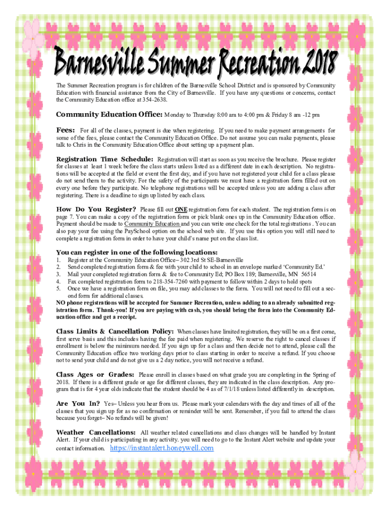 The Summer Recreation program is for children of the Barnesville School District and is sponsored by Community Education with financial assistance from the City of Barnesville. If you have any questions