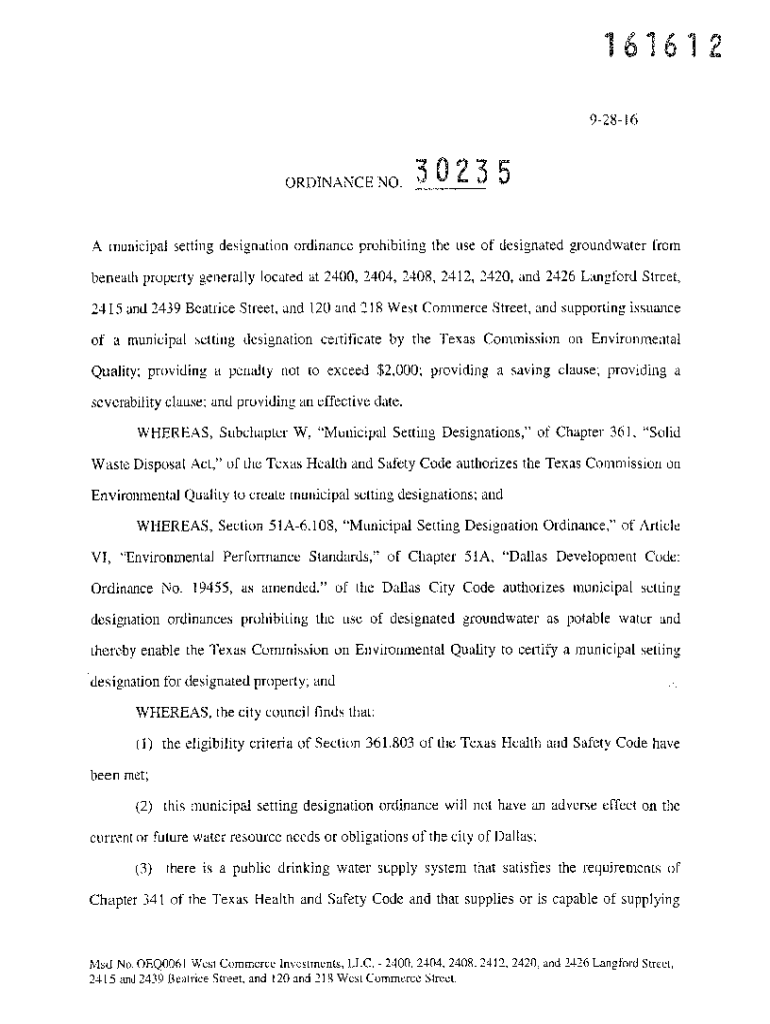 161612 92816ORDINANCE NO.3 0 23 5A municipal setting designation ordinance prohibiting the use of designated groundwater from beneath property generally located at 2400, 2404, 2408, 2412, 2420, and