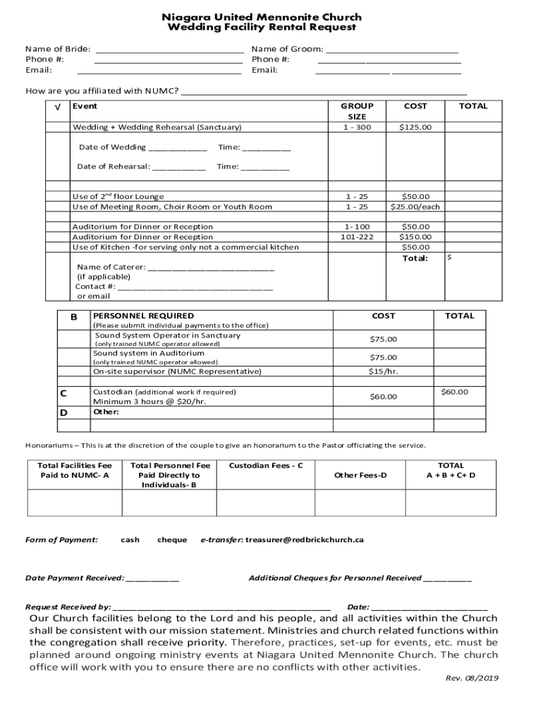 Niagara United Mennonite Church Wedding Facility Rental Request Name of Bride: ___ Name of Groom: ___ Phone #: ___ Phone #: ___ Email: ___ Email: ___ ___ How are you affiliated with NUMB? ___ Event