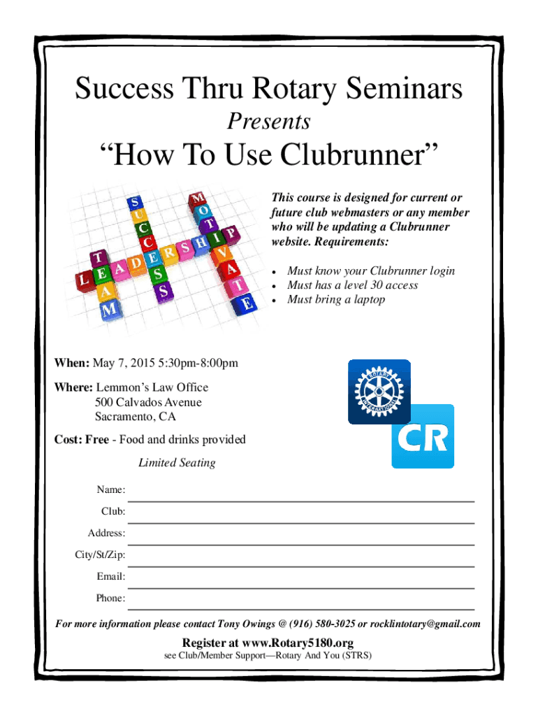 Success Through Rotary Seminars Presents To Use Club runner This course is designed for current or future club webmasters or any member who will be updating a Club runner website. Requirements: Must