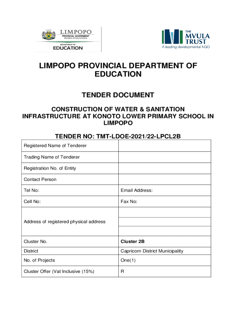 LIMPOPO PROVINCIAL DEPARTMENT OF EDUCATION TENDER DOCUMENT CONSTRUCTION OF WATER & SANITATION INFRASTRUCTURE AT ONTO LOWER PRIMARY SCHOOL IN LIMPOPO TENDER NO: TMTLDOE2021/22LPCL2B Registered Name