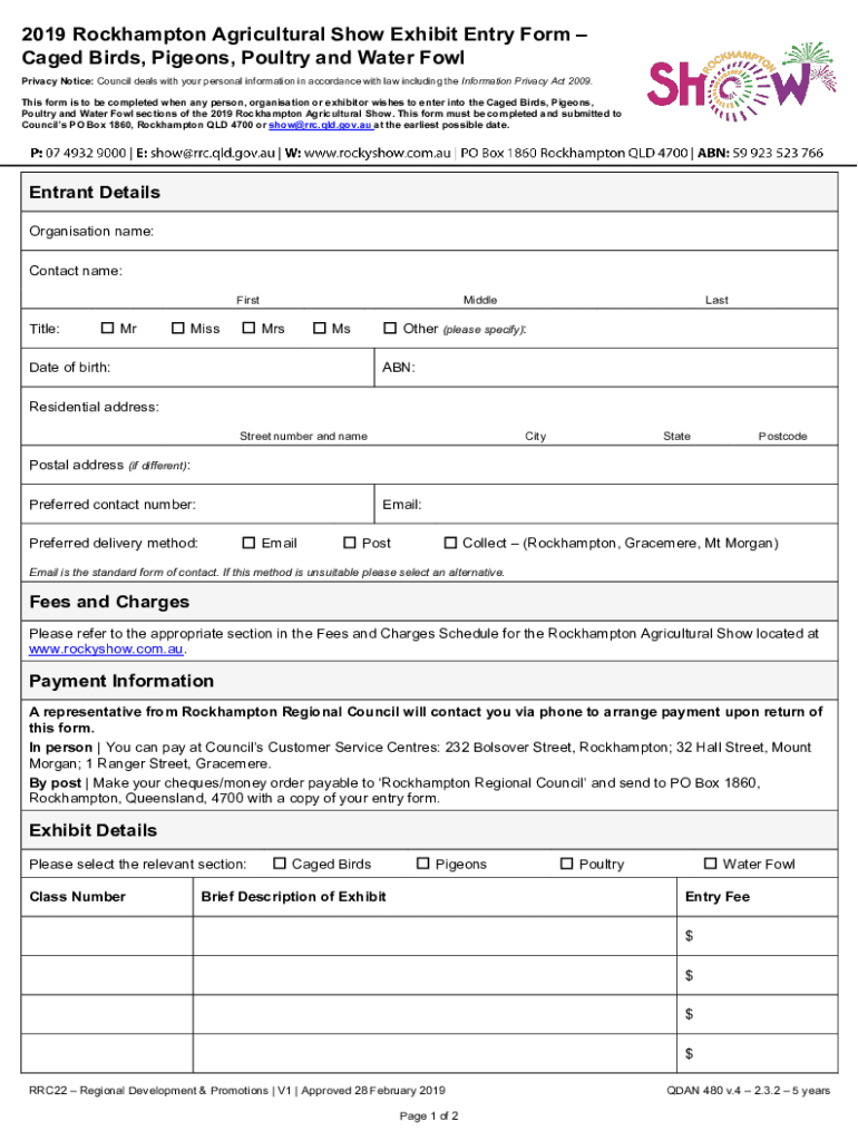 2019 Rockhampton Agricultural Show Exhibit Entry Form Caged Birds, Pigeons, Poultry and Water Fowl Privacy Notice: Council deals with your personal information in accordance with law including the