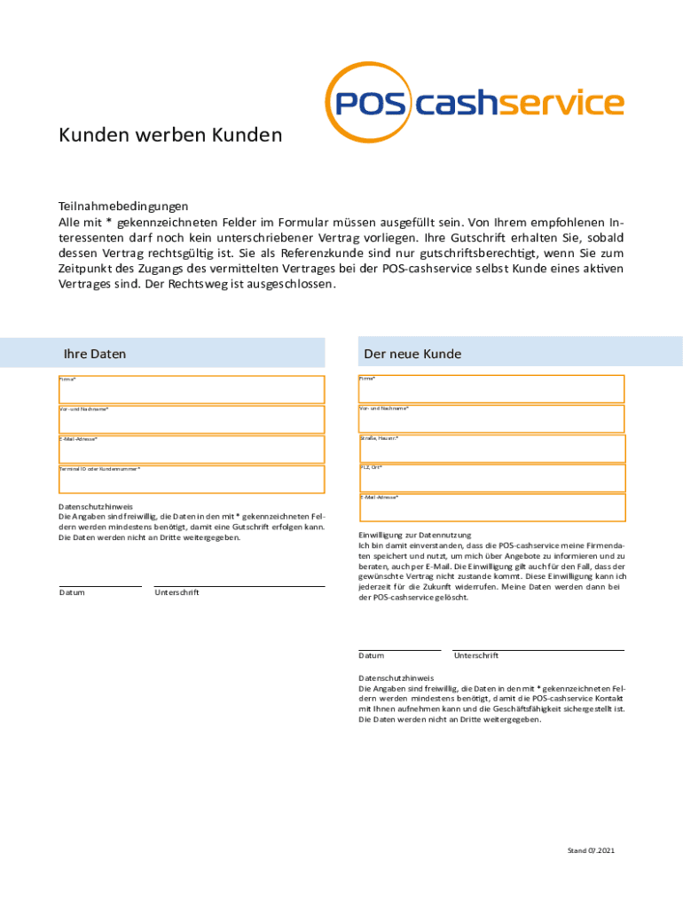 Auf dem Formular müssen in der Regel Name, Adresse und Kontaktdaten des neuen Kunden sowie die Kontaktdaten des Empfehlungsgebers angegeben werden.