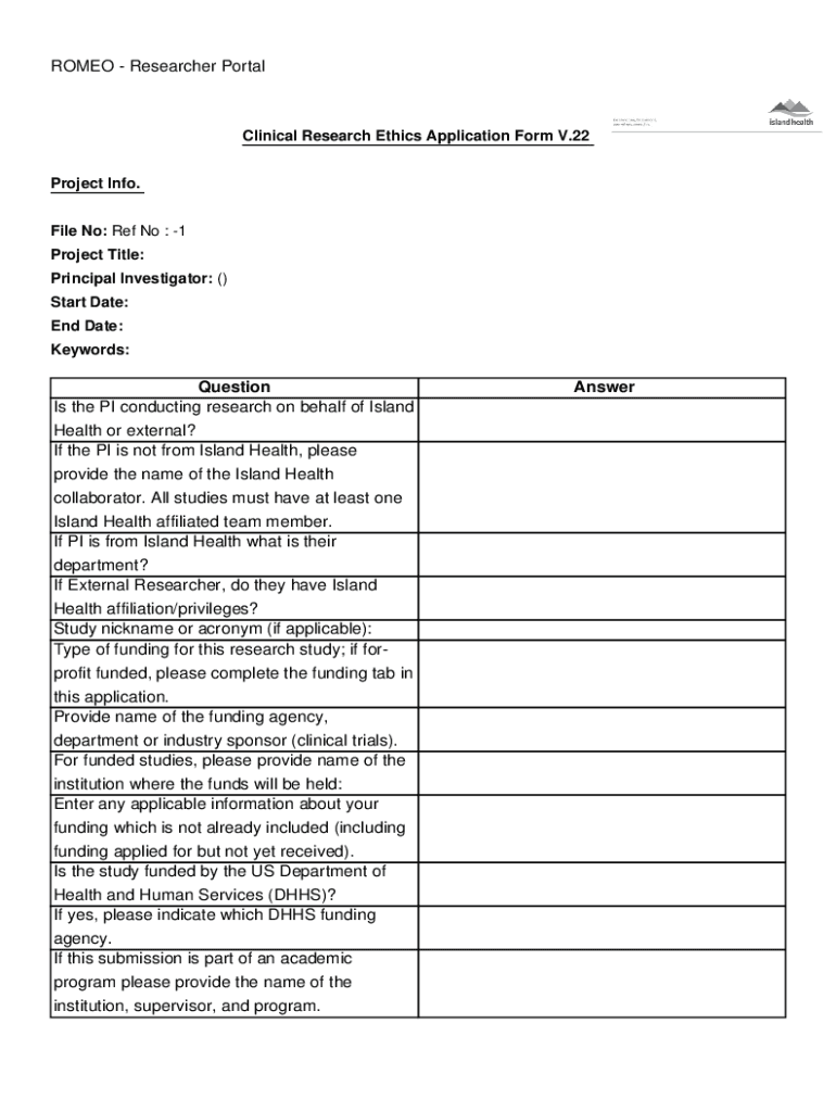 ROMEO Researcher PortalClinical Research Ethics Application Form V.22 Project Info. File No: Ref No : 1 Project Title: Principal Investigator: () Start Date: End Date: Keywords:Question Is the PI
