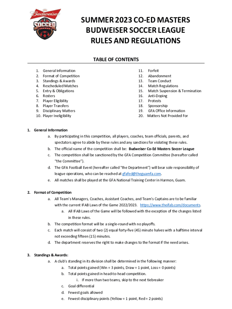 SUMMER 2023 COED MASTERS BUDWEISER SOCCER LEAGUE RULES AND REGULATIONS TABLE OF CONTENTS 1. 2. 3. 4. 5. 6. 7. 8. 9. 10. General Information Format of Competition Standings & Awards Rescheduled Matches