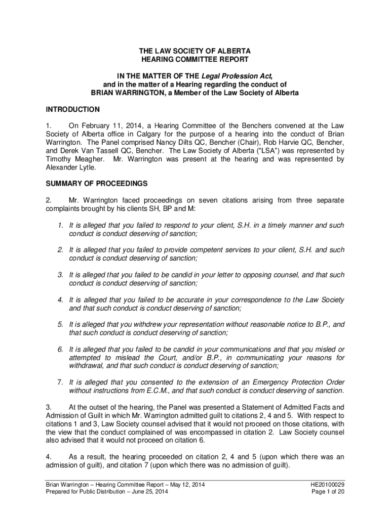 THE LAW SOCIETY OF ALBERTA HEARING COMMITTEE REPORT IN THE MATTER OF THE Legal Profession Act, and in the matter of a Hearing regarding the conduct of BRIAN WARRINGTON, a Member of the Law Society