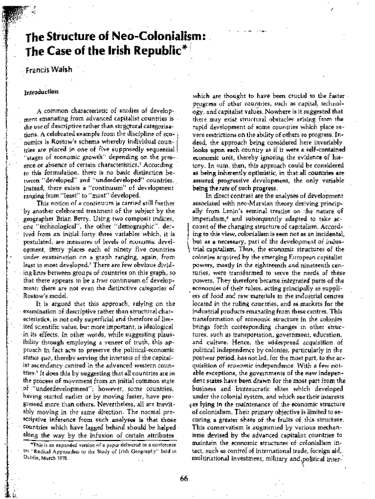 The Structure of Neocolonialism: The Case of the Irish Republic*\'..... Francis Walsh Introduction which are thought to have been crucial to the faster I\'progress of other countries, such as capital,