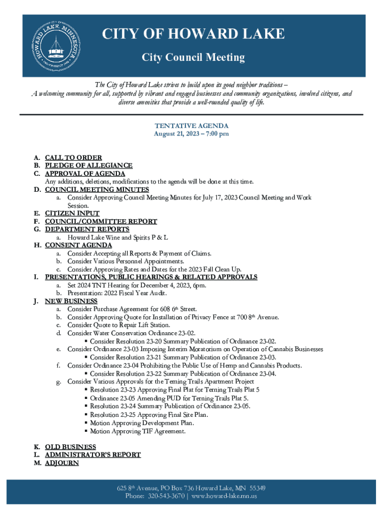 CITY OF HOWARD LAKE City Council Meeting The City of Howard Lake strives to build upon its good neighbor traditions A welcoming community for all, supported by vibrant and engaged businesses and community
