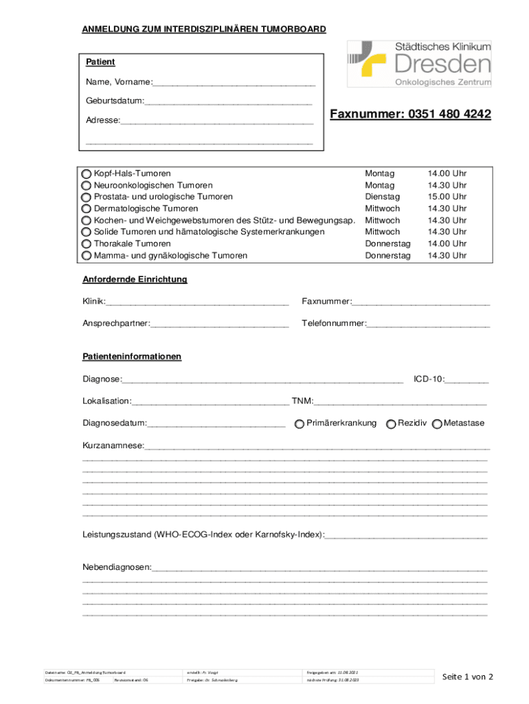 AMENDING SUM INTERDISZIPLINREN TUMORBOARDPatient Name, Surname:___ Geburtsdatum:___ Address:___Faxnummer: 0351 480 4242___ KopfHalsTumoren Neuroonkologischen Tumoren Prostate UND urological Tumoren