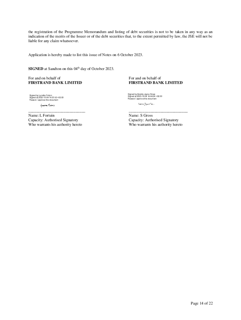 (Registration Number 1929/001225/06) (Incorporated with limited liability in the Republic of South Africa)Issue of ZAR50,000,000 Market track Europe Crossover Index Credit Linked Notes with Scheduled