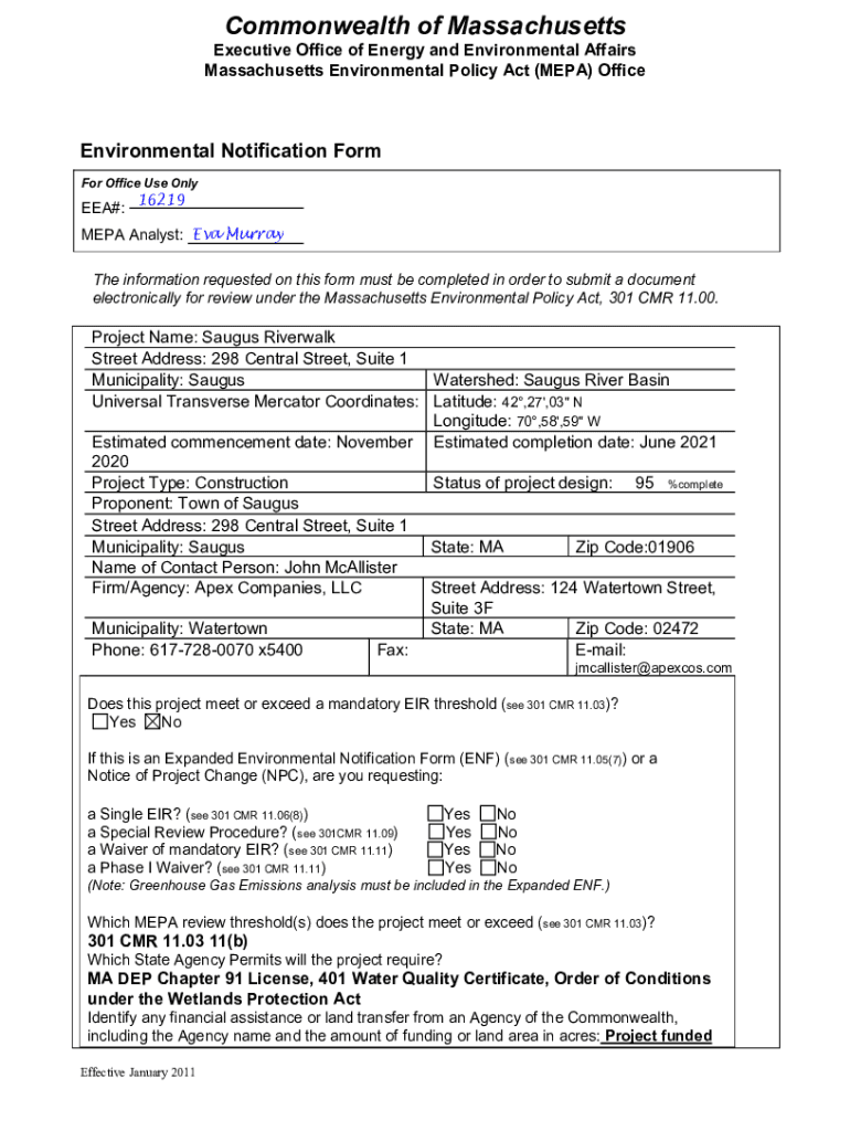 Commonwealth of MassachusettsExecutive Office of Energy and Environmental Affairs Massachusetts Environmental Policy Act (MEPA) OfficeEnvironmental Notification Form For Office Use Only EEA#:16219MEPA