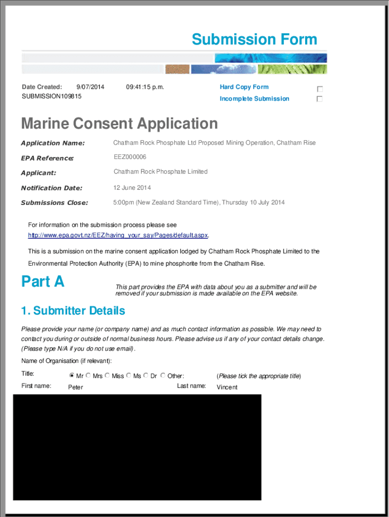 Submission Form Date Created: 9/07/2014 SUBMISSION10981509:41:15 p.m. Hard Copy Form c d e f incomplete Submission c d e f Marine Consent Application Name:Chatham Rock Phosphate Ltd Proposed Mining