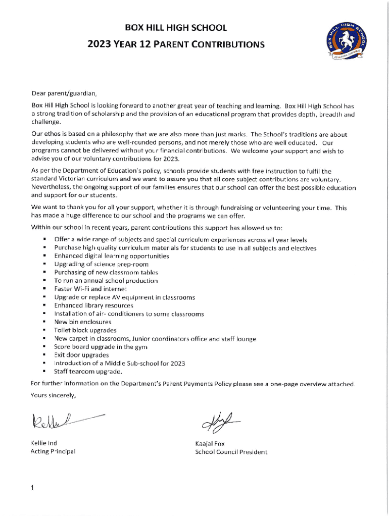 BOX HILL HIGH SCHOOL2023 YEAR 12 PARENT CONTRIBUTIONSCurriculum Contributions items and activities that students use, or participate in, to access the Curriculum All Year 12 students: Student ID Card