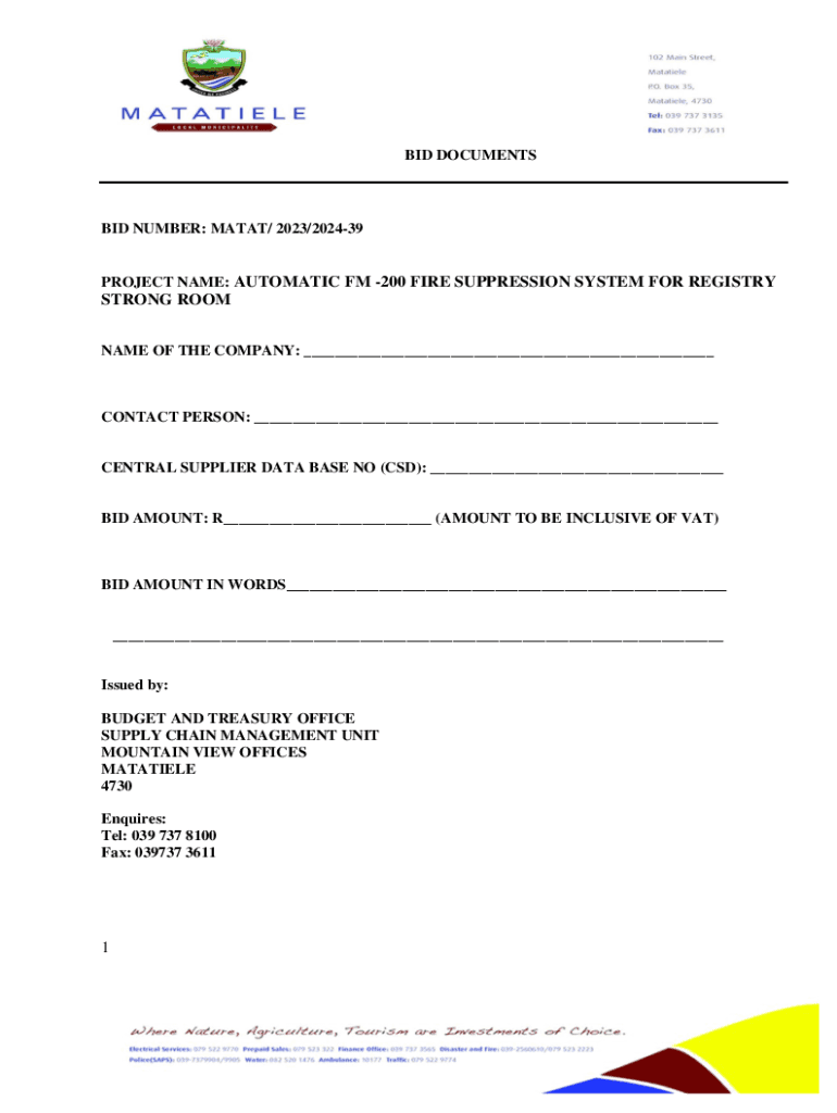 BID DOCUMENTS BID NUMBER: MATT/ 2023/202439PROJECT NAME: AUTOMATIC FM 200 FIRE SUPPRESSION SYSTEM FOR REGISTRYSTRONG ROOM