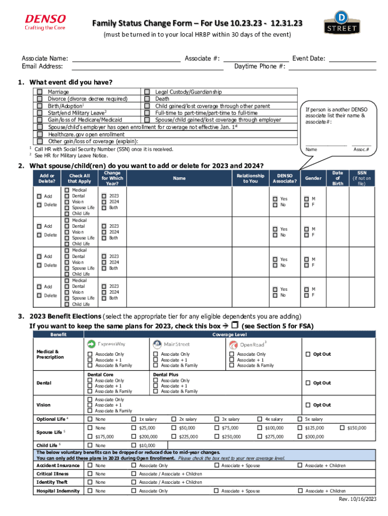 Family Status Change Form For Use 10.23.23 12.31.23 (must be turned in to your local HBP within 30 days of the event)Associate Name: Email Address:Associate #:Daytime Phone #:Event Date:1. What event