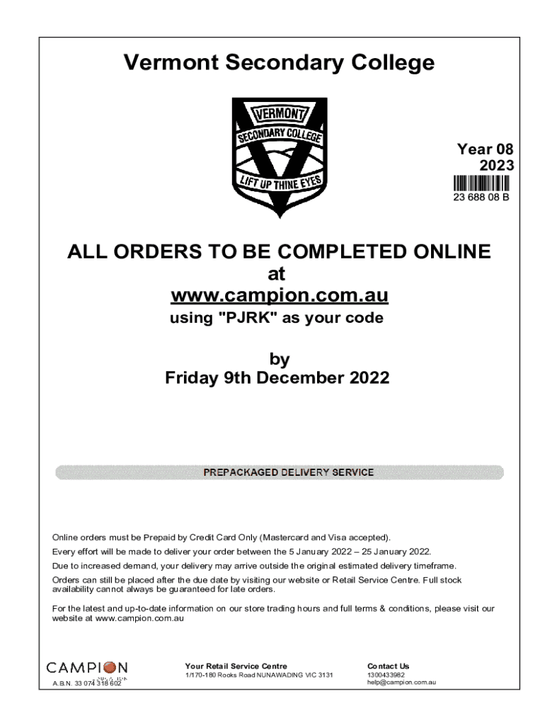 Friday 9th December 2022Online orders must be Prepaid by Credit Card