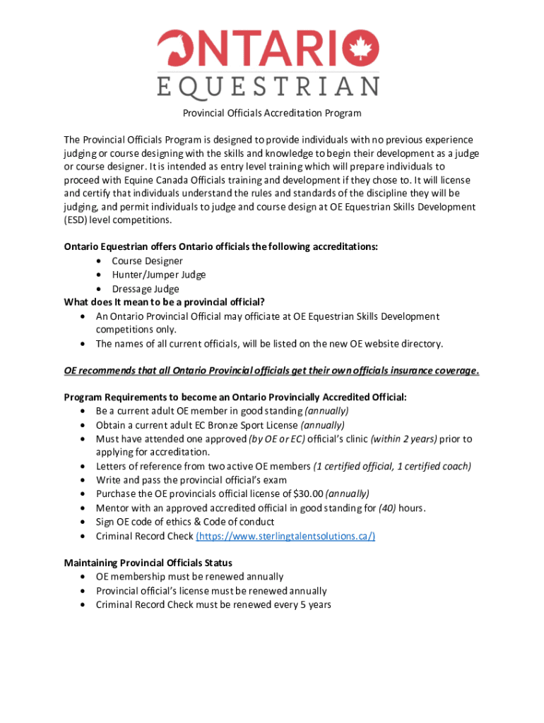 Provincial Officials Accreditation Program The Provincial Officials Program is designed to provide individuals with no previous experience judging or course designing with the skills and knowledge