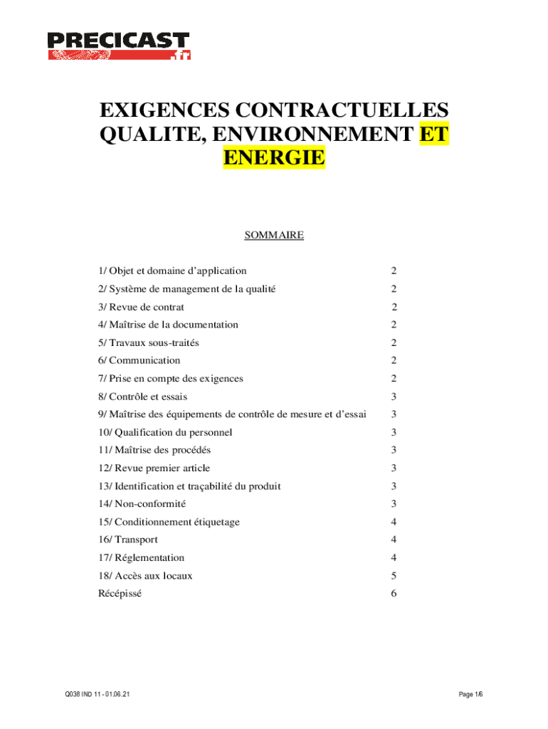 EXIGENCES CONTRACTUALLY QUALITY, ENVIRONMENT ET ENERGIESOMMAIRE1/ Object ET domain dapplication22/ System DE management DE la qualit23/ Revue de contrat24/ Mat rise DE la documentation25/ Travail