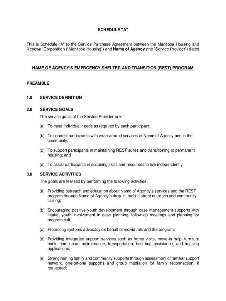 SCHEDULE \”A\”This is Schedule \”A\” to the Service Purchase Agreement between the Manitoba Housing and Renewal Corporation (Manitoba Housing) and Name of Agency (the Service Provider) dated