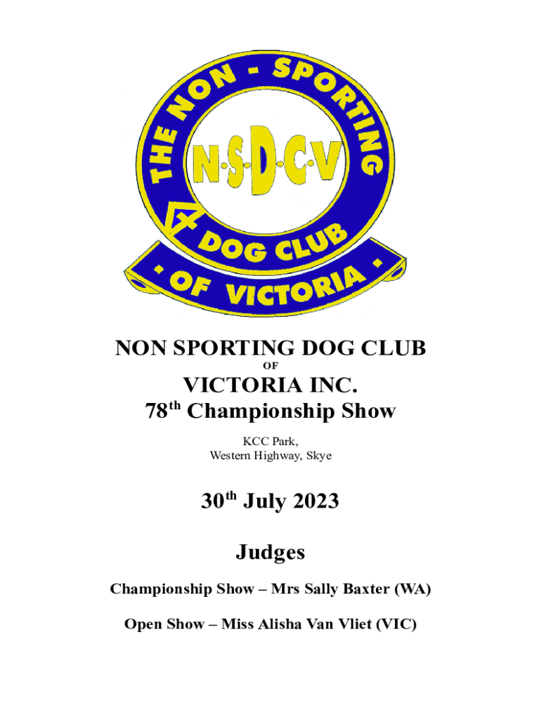 NON-SPORTING DOG CLUB VICTORIA INC. 78th Championship Show KCC Park, Western Highway, Skye30th July 2023 Judges Championship Show Mrs Sally Baxter (WA) Open Show Miss Alisha Van Plait (VIC)THE NON-SPORTING