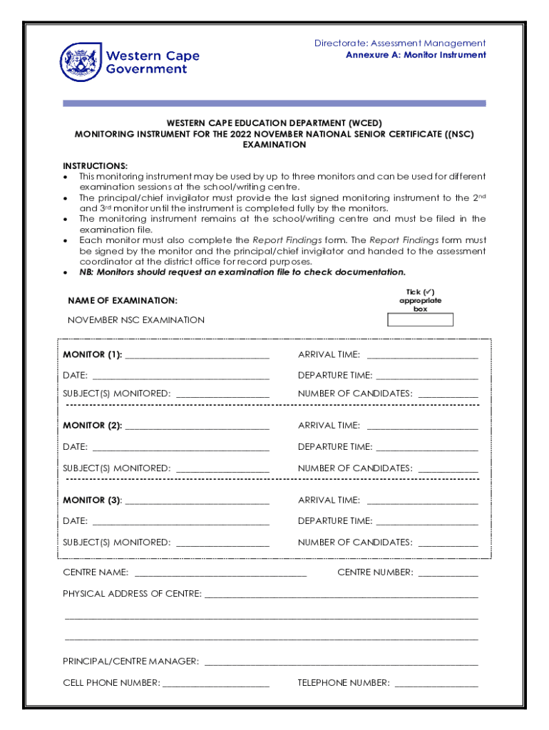 Directorate: Assessment Management Appendix A: Monitor InstrumentWESTERN CAPE EDUCATION DEPARTMENT (WED) MONITORING INSTRUMENT FOR THE 2022 NOVEMBER NATIONAL SENIOR CERTIFICATE ((NSC) EXAMINATION