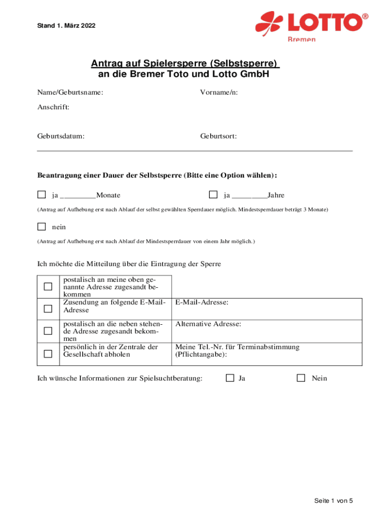 Holen Sie sich kostenlos Antrag auf Spielersperre (Selbstsperre) an die Bremer Toto ...