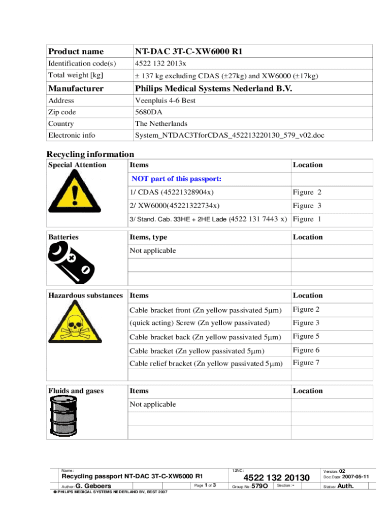 Product nameNTDAC 3TCXW6000 R1Identification code(s)4522 132 2013xTotal weight [kg] 137 kg excluding CDs (27 kg) and XW6000 (17 kg)Manufacturer Philips Medical Systems Nederland B.V. AddressVeenpluis
