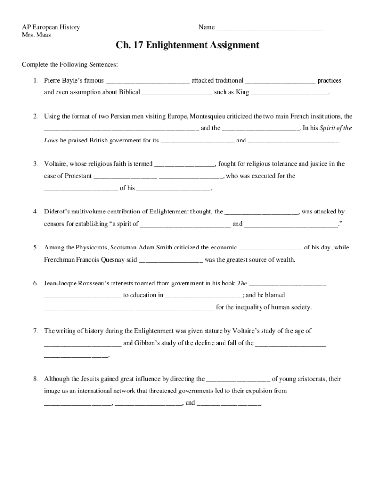 AP European History Mrs. Misname ___Ch. 17 Enlightenment Assignment Complete the Following Sentences: 1. Pierre Bales famous ___ attacked traditional ___ practices and even assumption about Biblical