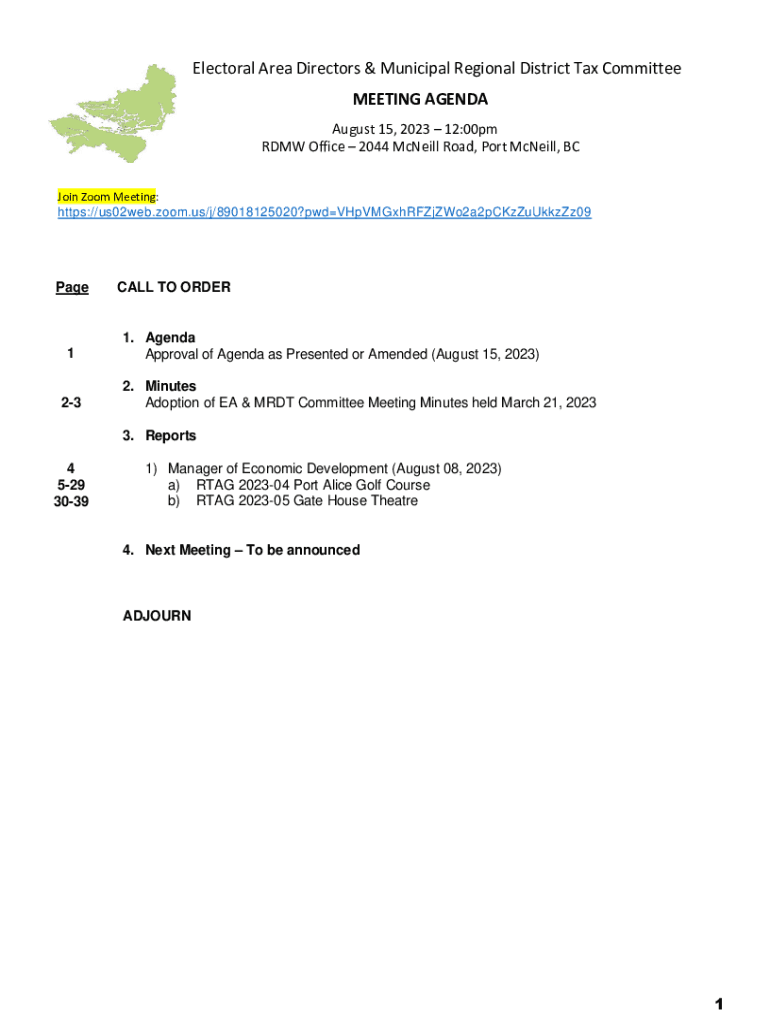 Electoral Area Directors & Municipal Regional District Tax Committee MEETING AGENDA August 15, 2023 12:00pm RDM Office 2044 McCall Road, Port McCall, BC Join Zoom Meeting: https://us02web.zoom.us/j/89018125020?pwdVHpVMGxhRFZjZWo2a2pCKzZuUkkzZz09Page123CALL