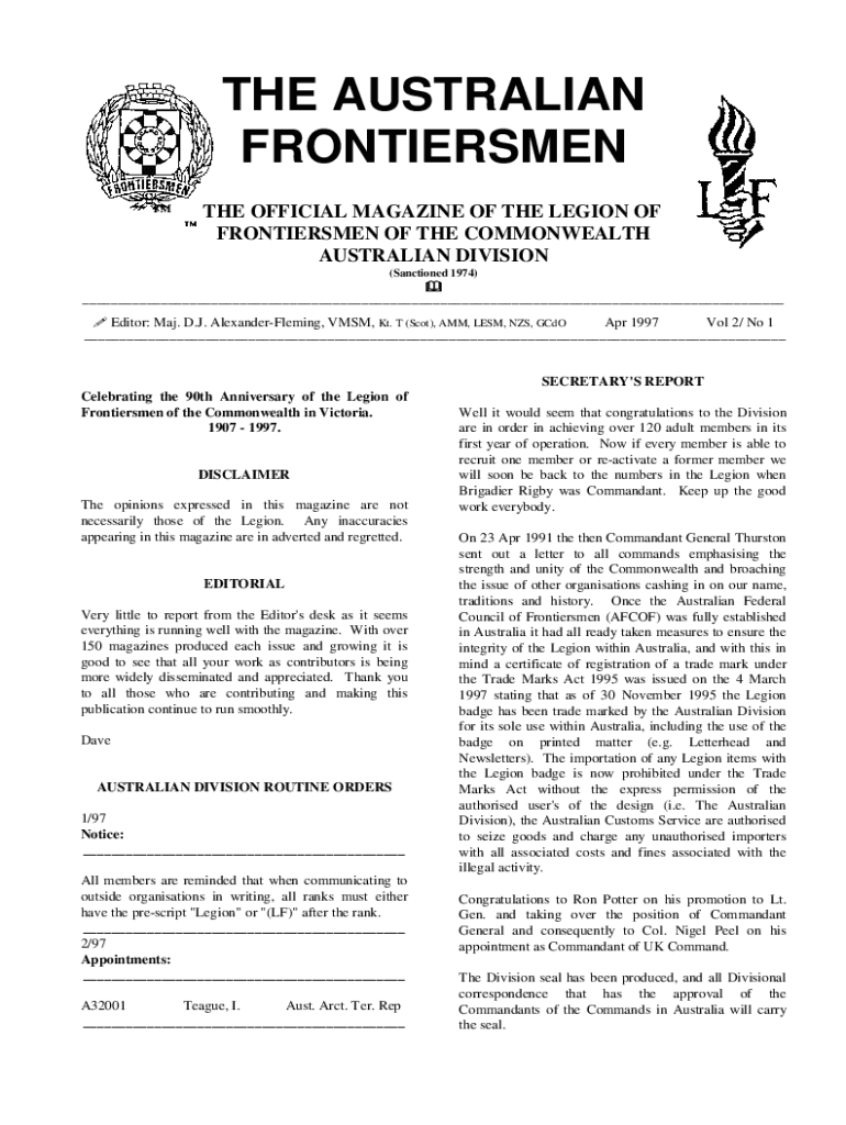 THE AUSTRALIAN FRONTIERSMEN THE OFFICIAL MAGAZINE OF THE LEGION OF FRONTIERSMEN OF THE COMMONWEALTH AUSTRALIAN DIVISION (Sanctioned 1974)! ___ \” Editor: Maj. D.J. Alexander Fleming, VMS, Kt. T