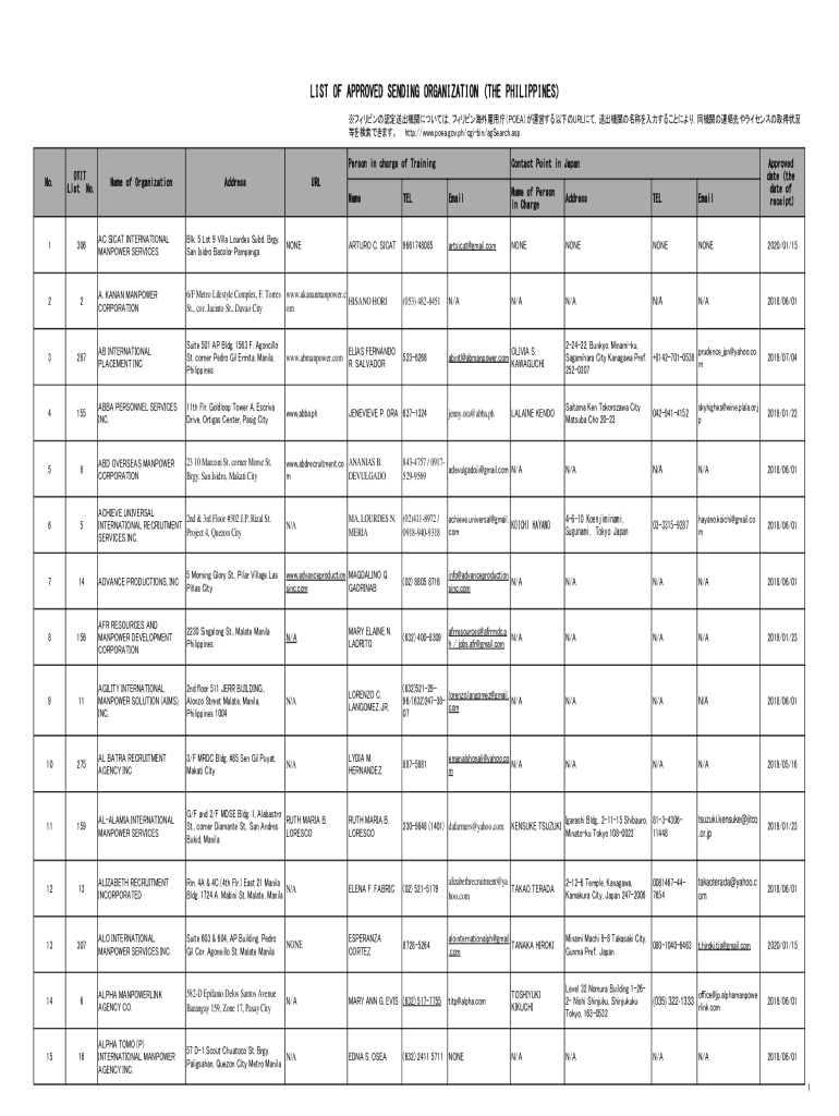 LIST OF APPROVED SENDING ORGANIZATION (THE PHILIPPINES) PEARL http://www.poea.gov.ph/cgibin/agSearch.asp Person in charge of Training No.OTIS List No. Name of OrganizationAddressContact Point in JapanNameTELEmailName.