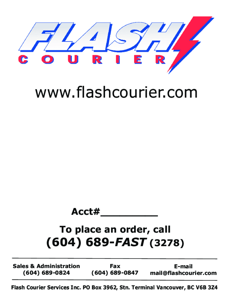 WWW.flash courier.compact#___ To place an order, call (604) 689FAST (3278) Sales & Administration (604) 6890824Fax (604) 6890847Email mail@flashcourier.comFlash Courier Services Inc. PO Box 3962,