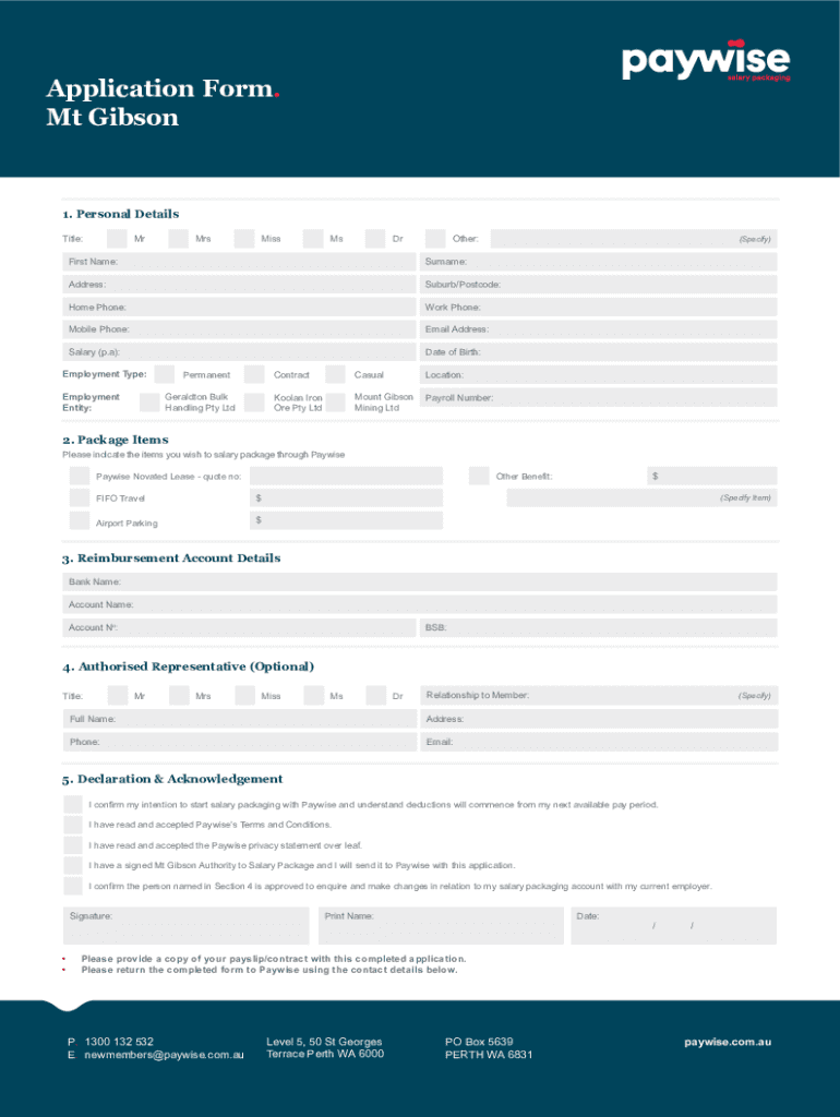 Application Form. Mt Gibson1. Personal Details Title:MrsMrMissMsDrOther:(Specify)First Name:Surname:Address:Suburb/Postcode:Home Phone:Work Phone:Mobile Phone:Email Address:Salary (p.a):Date of Birth:Employment