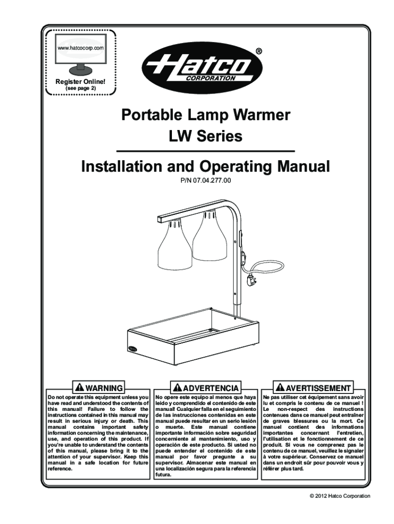 WWW.hatcocorp.register Online! (see page 2)Portable Lamp Warmer LAW SeriesInstallation and Operating Manual P/N 07.04.277.00WARNINGDo not operate this equipment unless you have read and understood