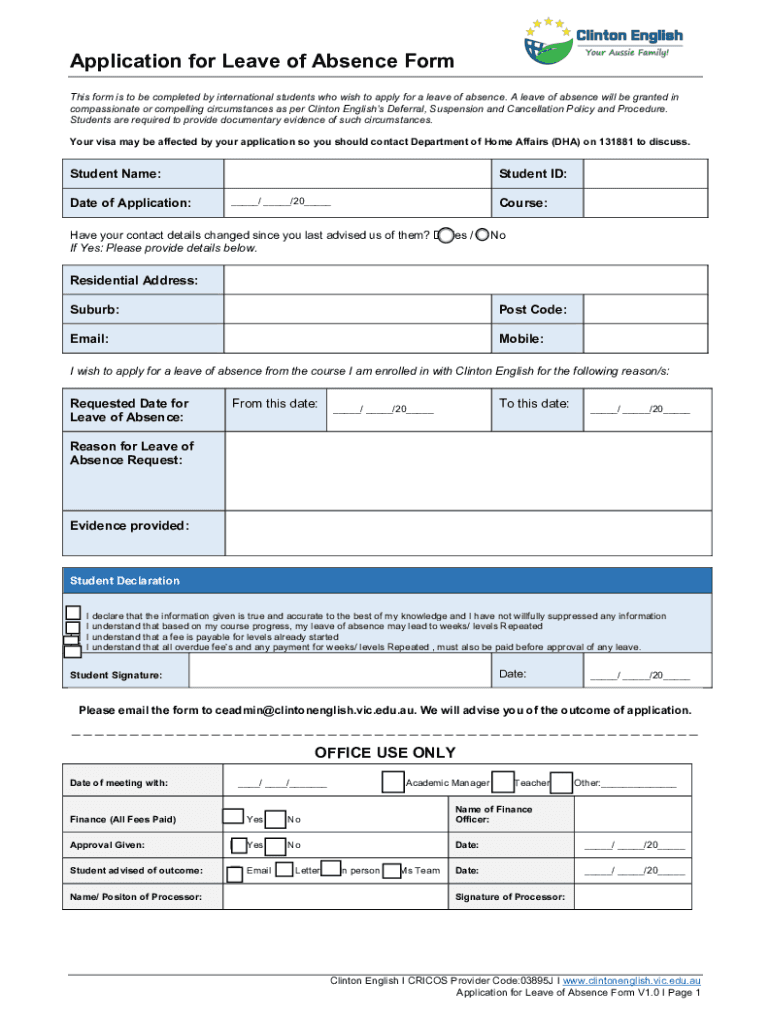 Application for Leave of Absence Form This form is to be completed by international students who wish to apply for a leave of absence. A leave of absence will be granted in compassionate or compelling