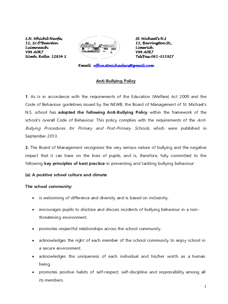 S.N. Which NAAFA, 11, Sr. Began Impeach. V94 A0K7 IMH. Roll 12834 SST. Michael's N. S 11, Barrington St., Limerick. V94 A0K7 Tel/Fax 061315927 Email: office.stmichaelsns@gmail.comAntiBullying Policy1.