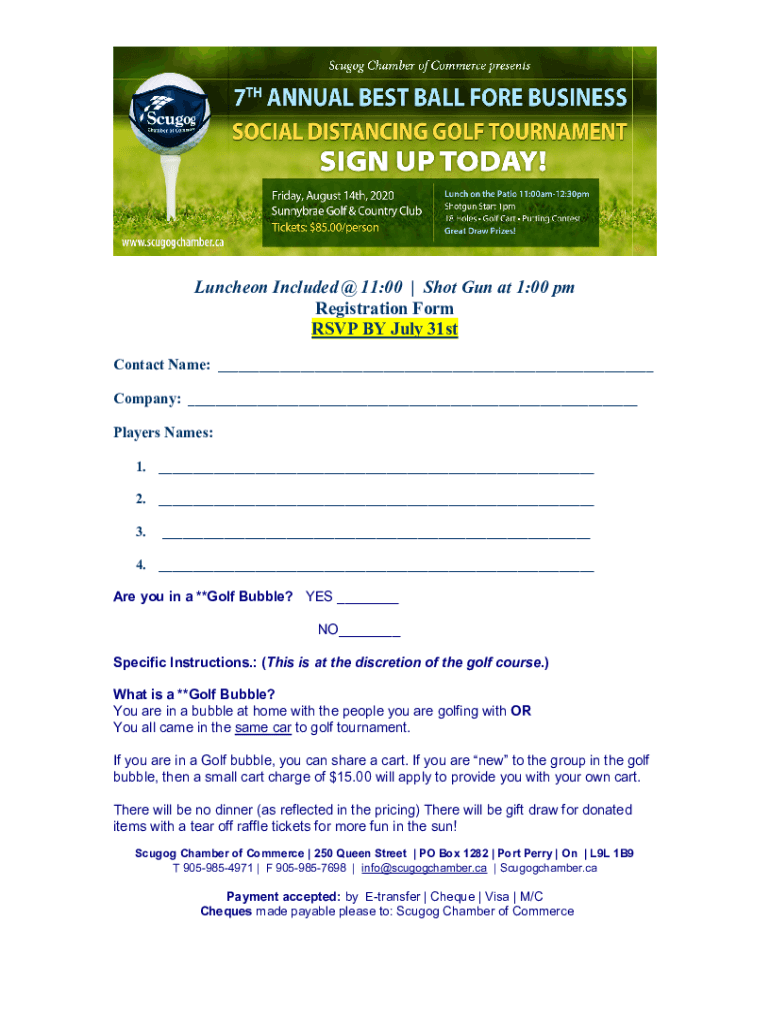 Luncheon Included @ 11:00 | Shot Gun at 1:00 pm Registration Form RSVP BY July 31st Contact Name: ___ Company: ___ Players Names: 1. ___ 2. ___ 3.___4. ___ Are you in a **Golf Bubble? YES ___ NO___