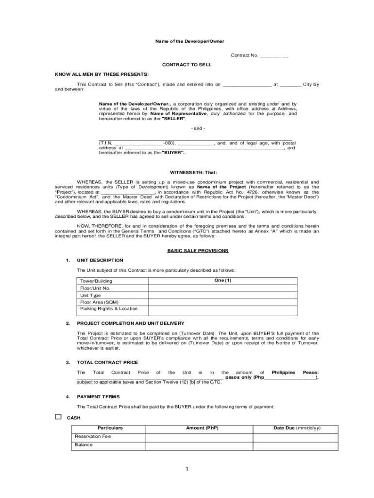 Name of the Developer/Owner Contract No. ___ __ CONTRACT TO SELL KNOW ALL MEN BY THESE PRESENTS: This Contract to Sell (this Contract), made and entered into on ___ at ___ City by and between: Name
