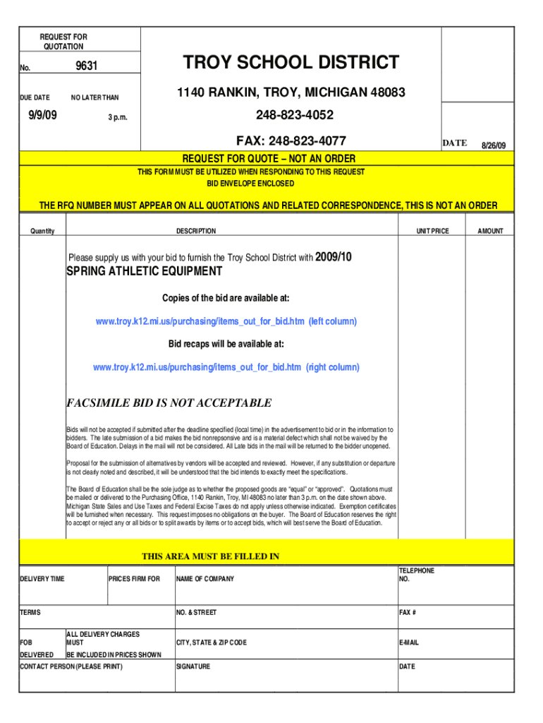 QUOTATIONTROY SCHOOL DISTRICT9631No. Do DATE9/9/091140 RANKIN, TROY, MICHIGAN 48083NO LATER THAN24882340523 p.m.FAX: 2488234077DATE8/26/09REQUEST FOR QUOTE NOT AN ORDER