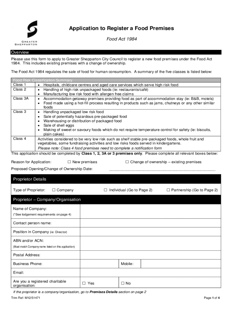 Application to Register Food Premises Food Act 1984 Overview Please use this form to apply to Greater Shepparton City Council to register a new food premises under the Food Act 1984. This includes