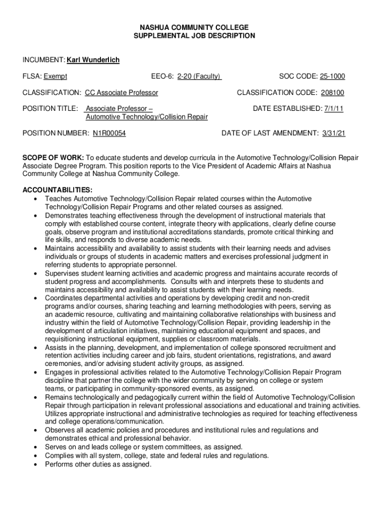 NASHUA COMMUNITY COLLEGE SUPPLEMENTAL JOB DESCRIPTIONINCUMBENT: Karl Wunderlist FLEA: ExemptEEO6: 220 (Faculty)CLASSIFICATION: CC Associate Professor POSITION TITLE:Associate Professor Automotive