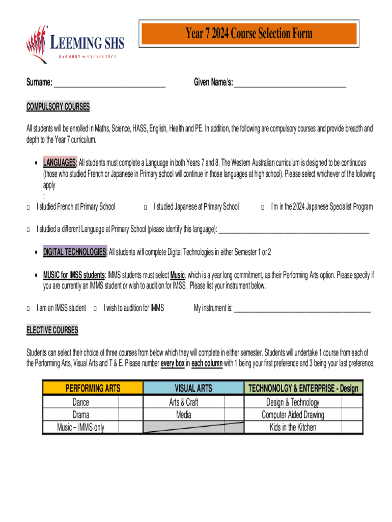 Get the free Year 7 2024 Course Selection Form