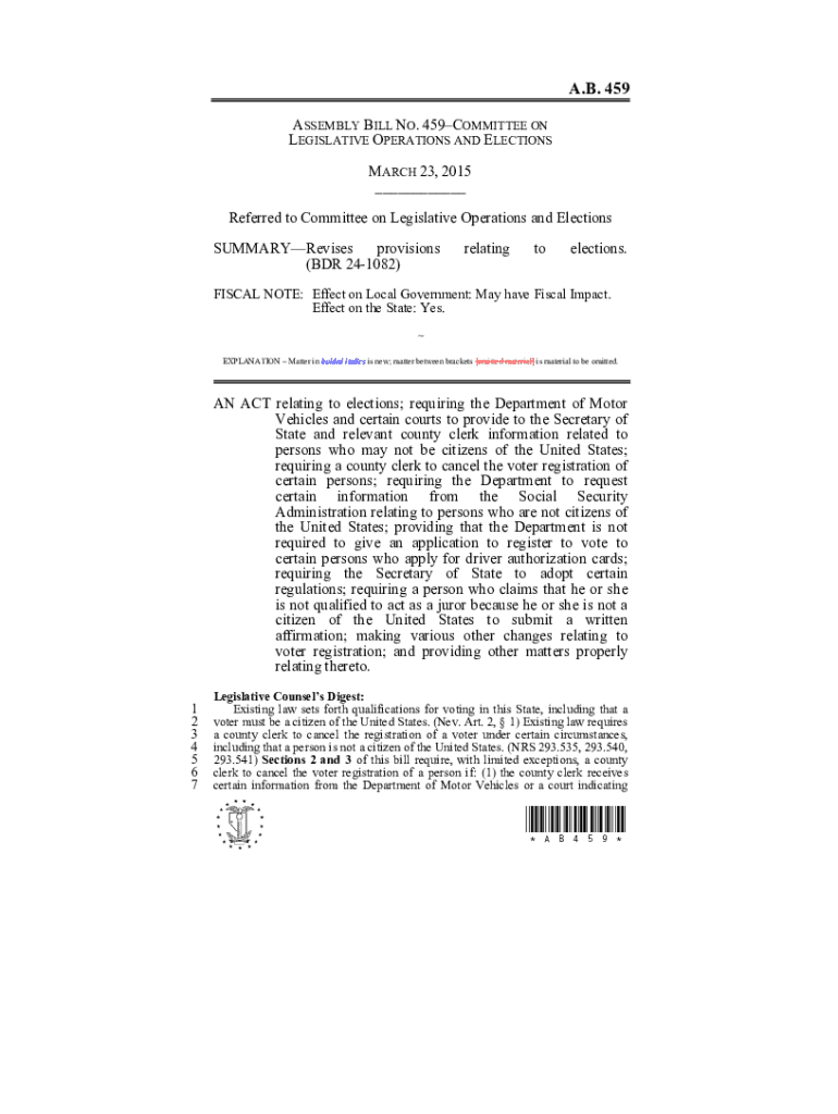 A.B. 459 ASSEMBLY BILL NO. 459COMMITTEE ON LEGISLATIVE OPERATIONS AND ELECTIONS MARCH 23, 2015 ___ Referred to Committee on Legislative Operations and Elections SUMMARYRevises provisions (BDR 241082)relatingtoelections.FISCAL