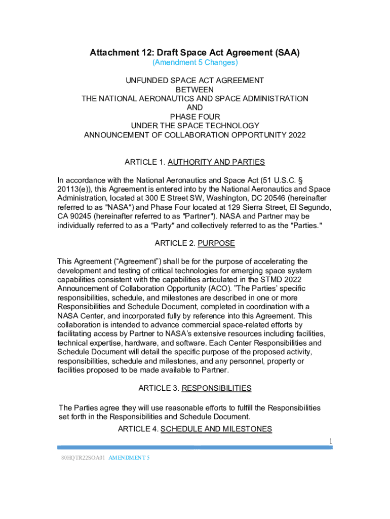 Attachment 12: Draft Space Act Agreement (SAA) (Amendment 5 Changes)UNFUNDED SPACE ACT AGREEMENT BETWEEN THE NATIONAL AERONAUTICS AND SPACE ADMINISTRATION AND PHASE FOUR UNDER THE SPACE TECHNOLOGY