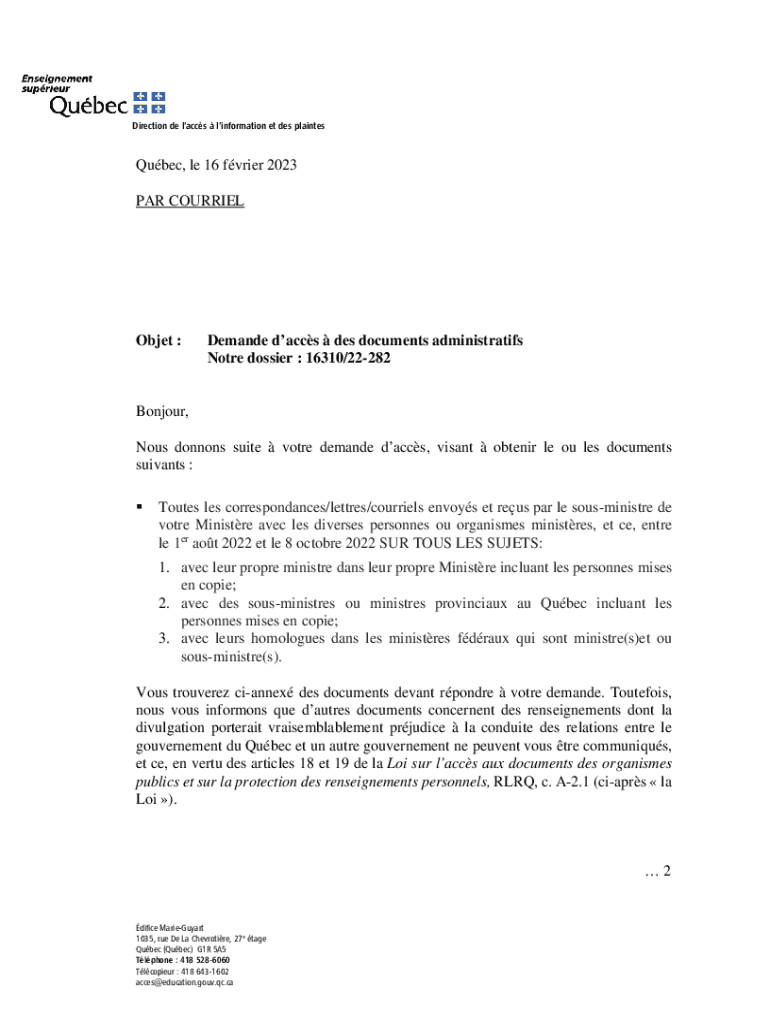 Direction DE lacks information et DES plaintesQubec, LE 16 frier 2023