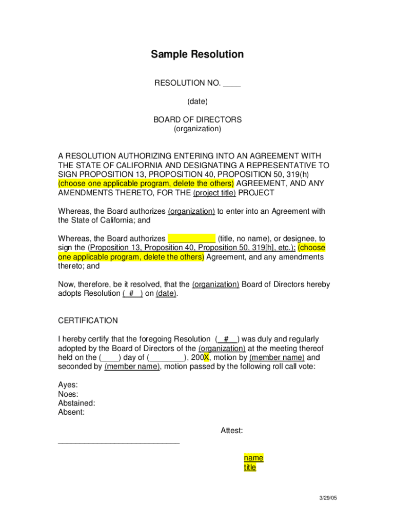 Sample Resolution NO. ___ (date) BOARD OF DIRECTORS (organization) A RESOLUTION AUTHORIZING ENTERING INTO AN AGREEMENT WITH THE STATE OF CALIFORNIA AND DESIGNATING A REPRESENTATIVE TO SIGN PROPOSITION