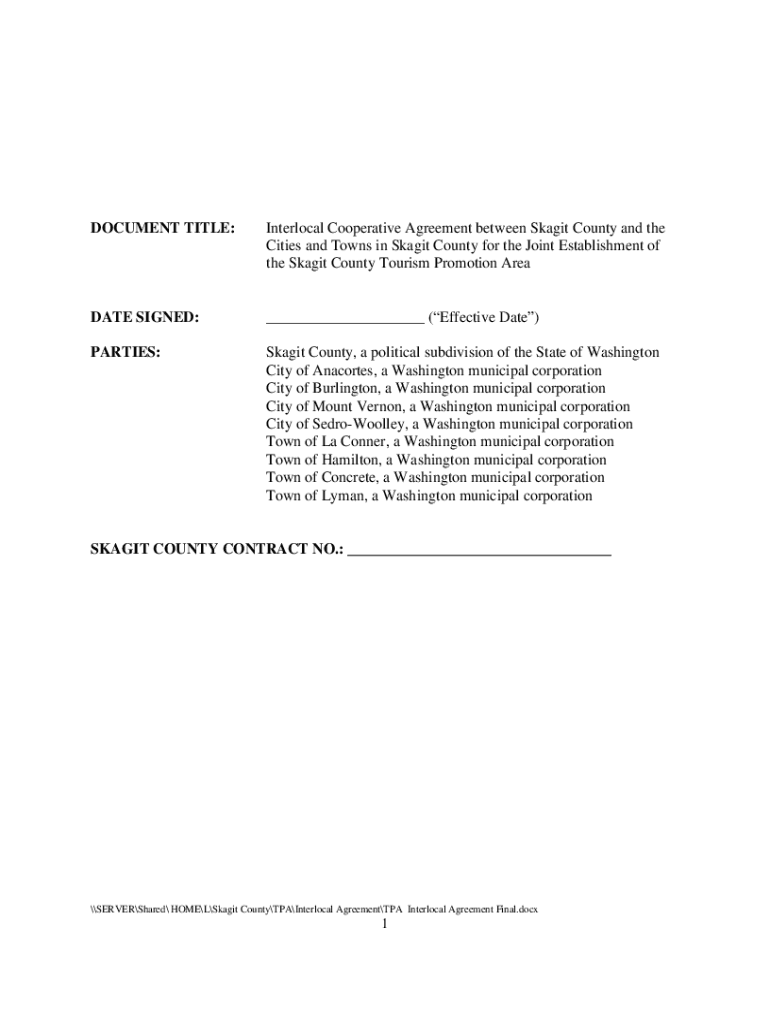 DOCUMENT TITLE:Interlocal Cooperative Agreement between Skagit County and the Cities and Towns in Skagit County for the Joint Establishment of the Skagit County Tourism Promotion Predate SIGNED:___