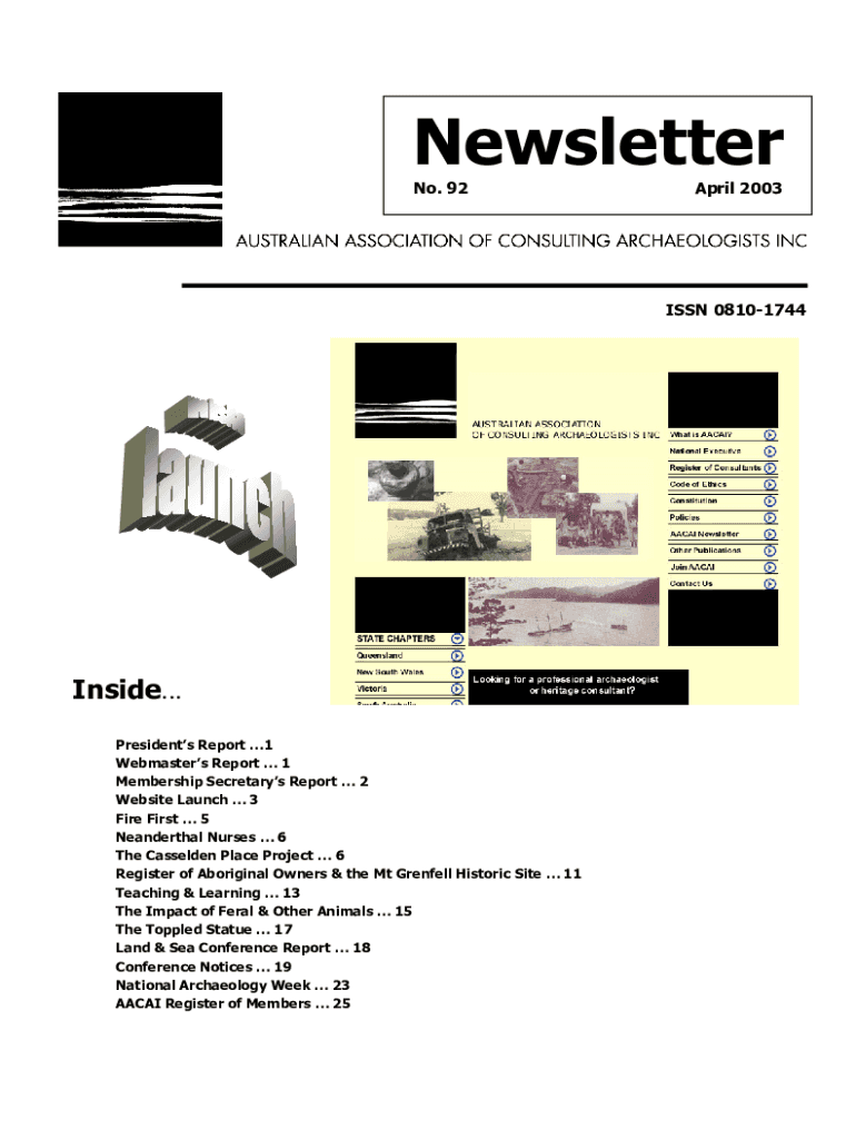 Newsletter No. 92April 2003ISSN 08101744Inside... Presidents Report 1 Webmasters Report 1 Membership Secretary's Report 2 Website Launch 3 Fire First 517 Neanderthal Nurses 6 The Cassette Place Project