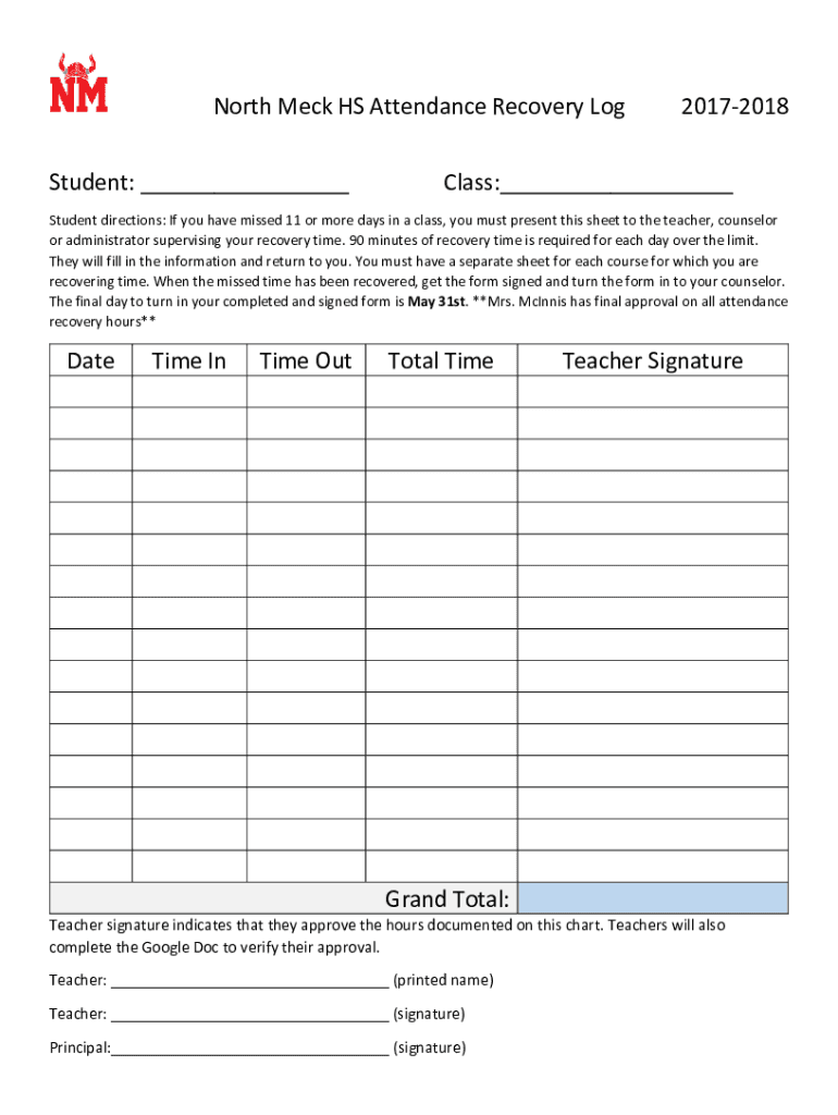 North Deck HS Attendance Recovery Log Student: ___20172018Class:___Student directions: If you have missed 11 or more days in a class, you must present this sheet to the teacher, counselor or administrator